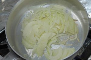 1. 鍋にオリーブオイルを敷き、たまねぎのスライスをしんなりするまで炒めます。