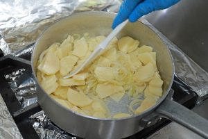 2. 新じゃがいものスライスを加えて炒め、塩・と白こしょうで下味をつけます。