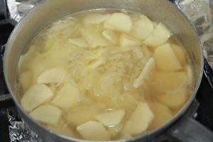 3. 新じゃがいもの周りが透き通ってきたら「ふじざくら命水」を加え、柔らかくなるまで煮込みます。
