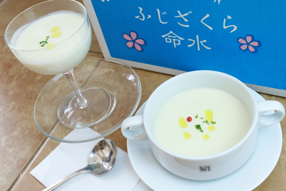 シルバンズのシェフ監修による、富士山の天然水「ふじざくら命水」をつかった簡単でおいしいレシピをご紹介します。肌寒い日には温かいまま「ポタージュ」として、暑い日には冷やして「ビシソワーズ」としてお楽しみいただけます。おいし