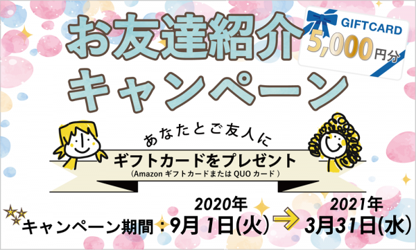 ご紹介者の「あなた」とご紹介いただく「お友達」お二人に「Amazonギフトカード」または「QUOカード」5,000円分
