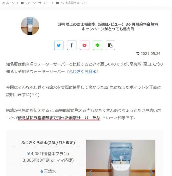 実際にレビューし、得た経験を分かりやすく発信している暮らしに役立つ水メディア「水LOVE」にふじざくら命水の記事が掲載されました。